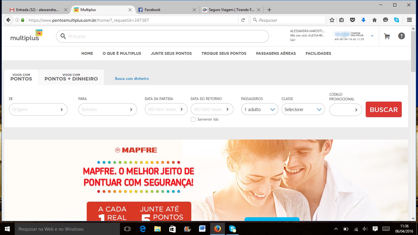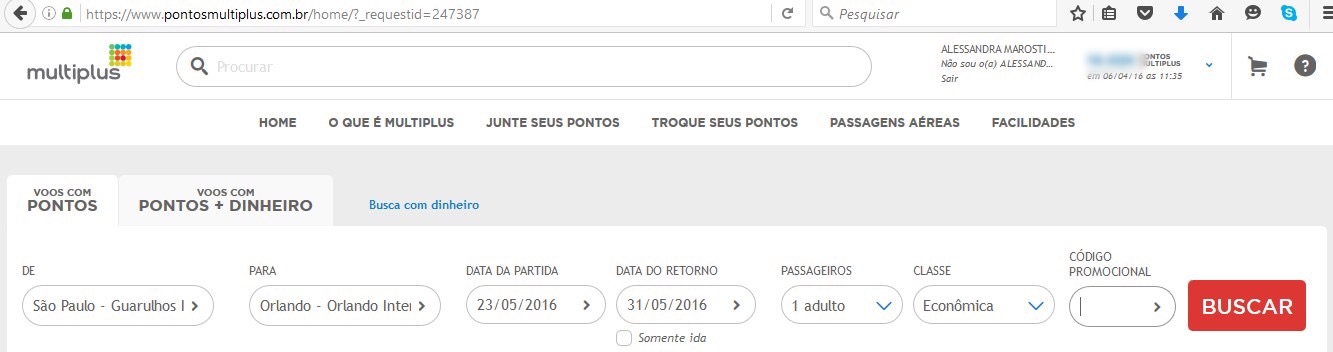 Para começar acesse o site www.pontosmultiplus.com.br e faça o login. Na primeira página já vão aparecer os espaços para busca de origem, destino e datas para o voo que você deseja.