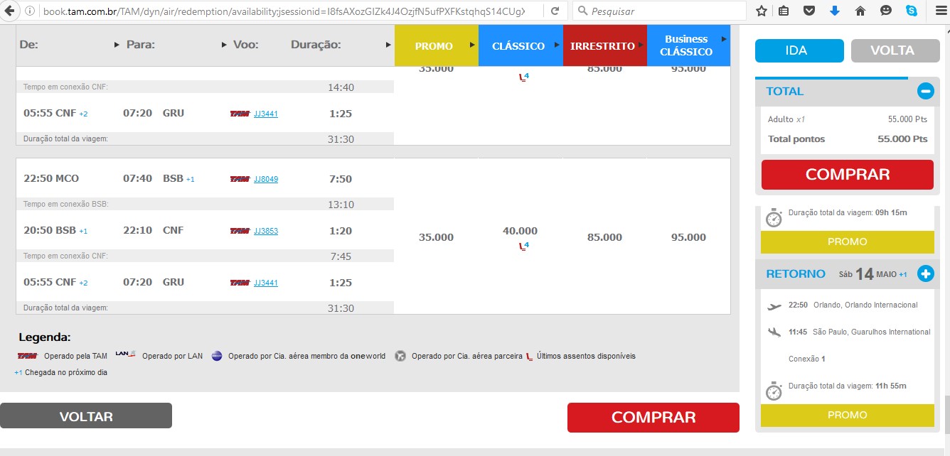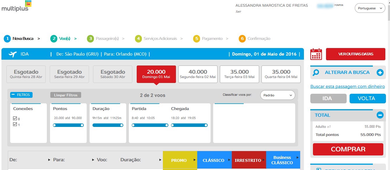 Na página seguinte vão aparecer as opções de voo e o número de pontos necessários para a compra. As vezes existem preços promocionais e vão estar sinalizados como “PROMO”. Você também pode abrir o calendário clicando em “VER OUTRAS DATAS” e verificar quais os dias mais baratos para voar. Os pontos são utilizados para pagar somente as passagens aéreas. As taxas de embarque são pagas a parte e variam de acordo com o aeroporto.